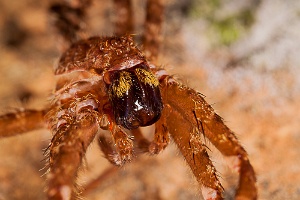 Possivelmente uma Miturgidae fêmea, dada a quantidade e disposição dos olhos e a ausência do bulbo palpal nos pedipalpos. Encontrada em uma trilha em Suzano/SP.…